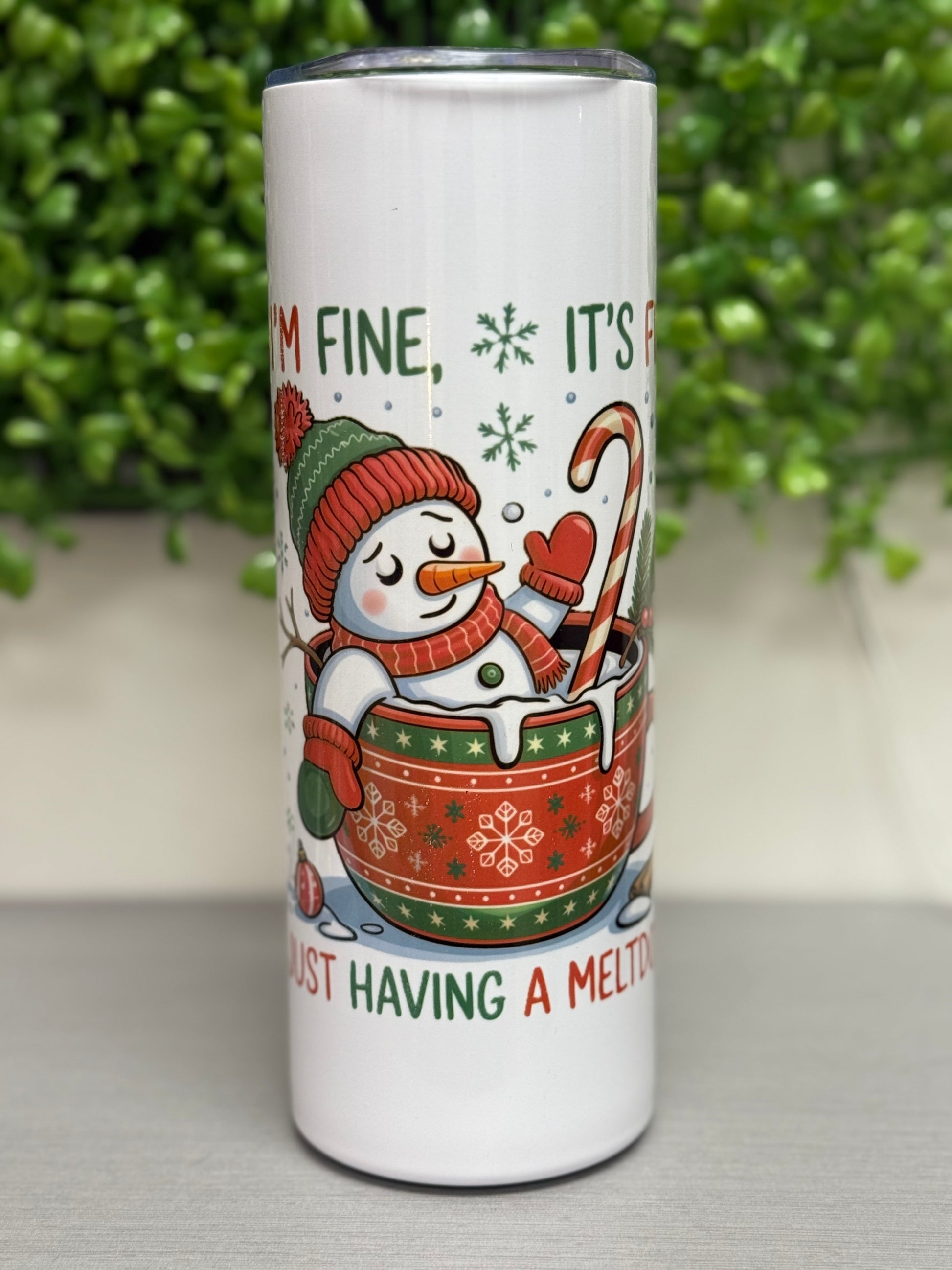 Embrace the holiday humor with this 20 oz. tumbler featuring a witty "just having a melt down" snowman design. Perfect for coffee, hot cocoa, or cold beverages, this durable drinkware keeps drinks at the ideal temperature while adding a playful touch to your seasonal collection. The generous capacity makes it ideal for all-day sipping, and the festive artwork captures that relatable holiday chaos with charm. A must-have gift for anyone who appreciates witty winter humor and quality everyday drinkware.